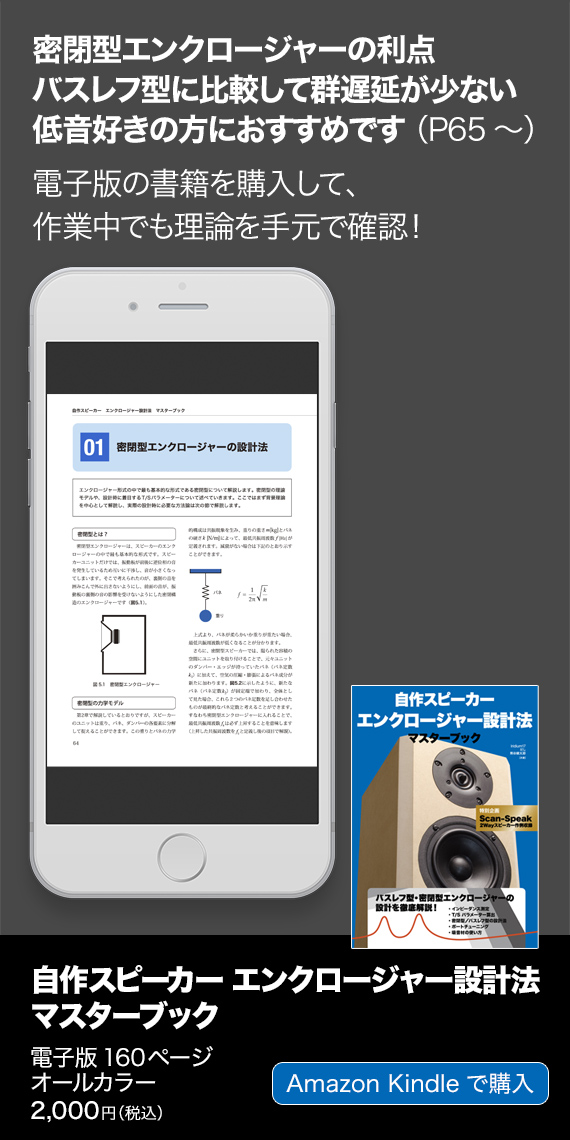 自作スピーカーデザインレシピマスターブックの第2章 2Way ブックシェルフ バスレフ型を購入したKと申します。まだ視聴環境を整えてないのですが、自分の感じたファーストインプレッションを述べたいと思います。現在使おうと思っていたSANSUIのアンプを修理に出している最中なことと、スピーカースタンドを自作しようと木材を注文しているため、それらが揃っていない点をご容赦ください。