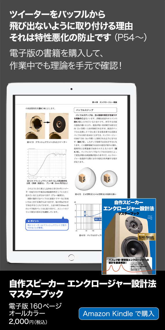 写真にもあるように、榎本さんのリファレンススピーカーは、『自作スピーカー デザインレシピ集 マスターブック』の第5章「3Wayトールボーイ・バスレフ型」モデル、通称“髙山モデル”です。榎本さんの言葉を借りれば「早い話が買ったんだよ!」ということで、試聴いただいた後に大変気に入っていただけ、購入への話になりました。試聴レンタルのつもりでしたが、私たちのところに戻ることはありませんでした。
