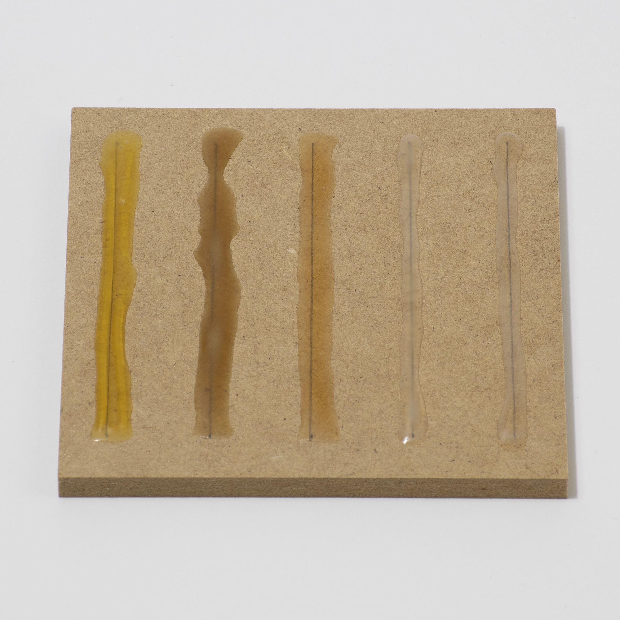 塗りたての状態では、タイトボンド オリジナルが黄みがかっており、タイトボンド3とゴリラは若干褐色です。コニシのボンドは真っ白ですね。12時間乾燥後には、すべてのボンドが硬化しており、MDFに書いた線が見えるほど透明になっています。コニシのボンドほぼ透明ですが、 タイトボンド オリジナル、タイトボンド3、ゴリラはかなり濃い褐色となりました。横からの図では、硬化後の収縮率が分かります。あまり有意な差は認められませんが、タイトボンド オリジナルが最も収縮したようです。